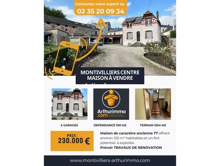 MONTIVILLIERS CENTRE En plein centre de Montivilliers, dÃ?©couvrez cette maison de caractÃ?¨re ancienne T7 offrant environ 120 m² habitables et un fort potentiel. Au rez-de-chaussÃ?©e : entrÃ?©e, cuisine et arriÃ?¨re-cuisine, sÃ?©jour, salon, une chambre, salle de bains et dressing. Ã?€ lâ€â?¢Ã?©tage : palier, trois chambres et une piÃ?¨ce supplÃ?©mentaire offrant la possibilitÃ?© de crÃ?©er une seconde salle de bains. Le bien dispose Ã?©galement dâ€â?¢une cave complÃ?¨te, de quatre garages et dâ€â?¢une dÃ?©pendance dâ€â?¢environ 100 m². Des travaux de rÃ?©novation sont Ã? prÃ?©voir, permettant de redonner tout son charme Ã? cette demeure. Le tout est Ã?©difiÃ?© sur une parcelle de terrain de 1 200 m², idÃ?©ale pour un artisan ou un projet familial avec espace de stockage. Ã?€ saisir sans tarder ! RÃ?©f : RB3318 Ce bien vous est proposÃ?© par RÃ?©nald BARBEROT, votre expert immobilier agrÃ?©Ã?©.